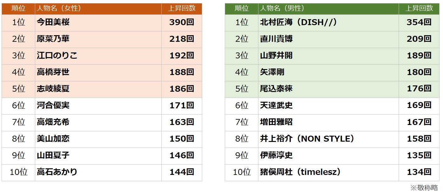 2024年と2025年を比較した急上昇TV番組出演ランキングでは、連続テレビ小説「あんぱん」出演の今田美桜、北村匠海(DISH//)が男女それぞれのトップとなった。その他、2025年に躍進した河合優実、猪俣周杜(timelesz)らがランクインしている。