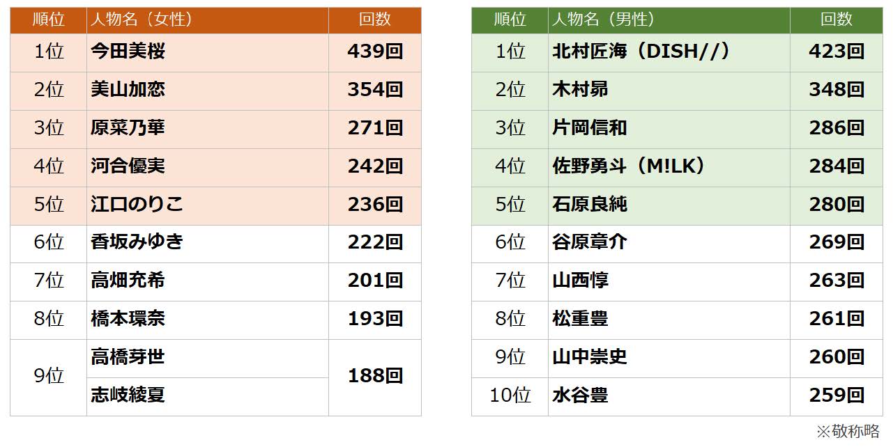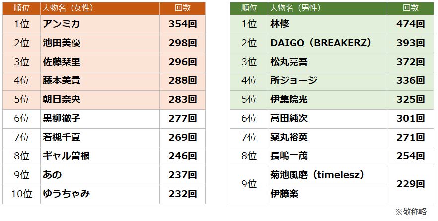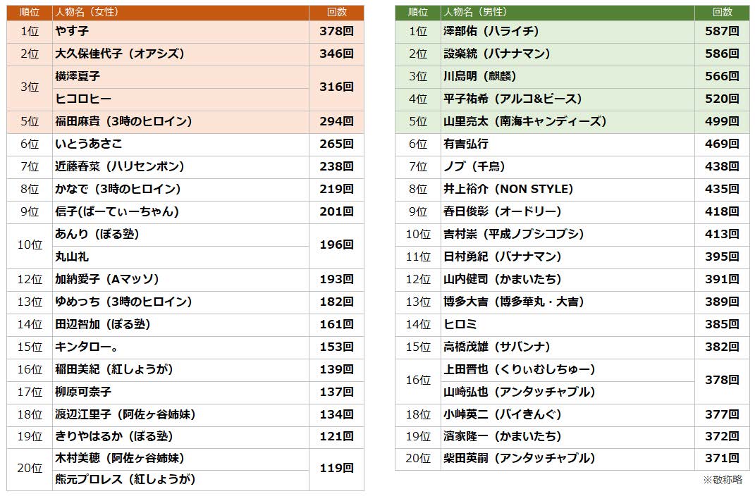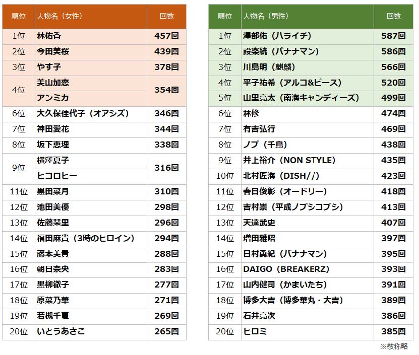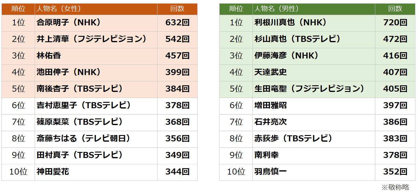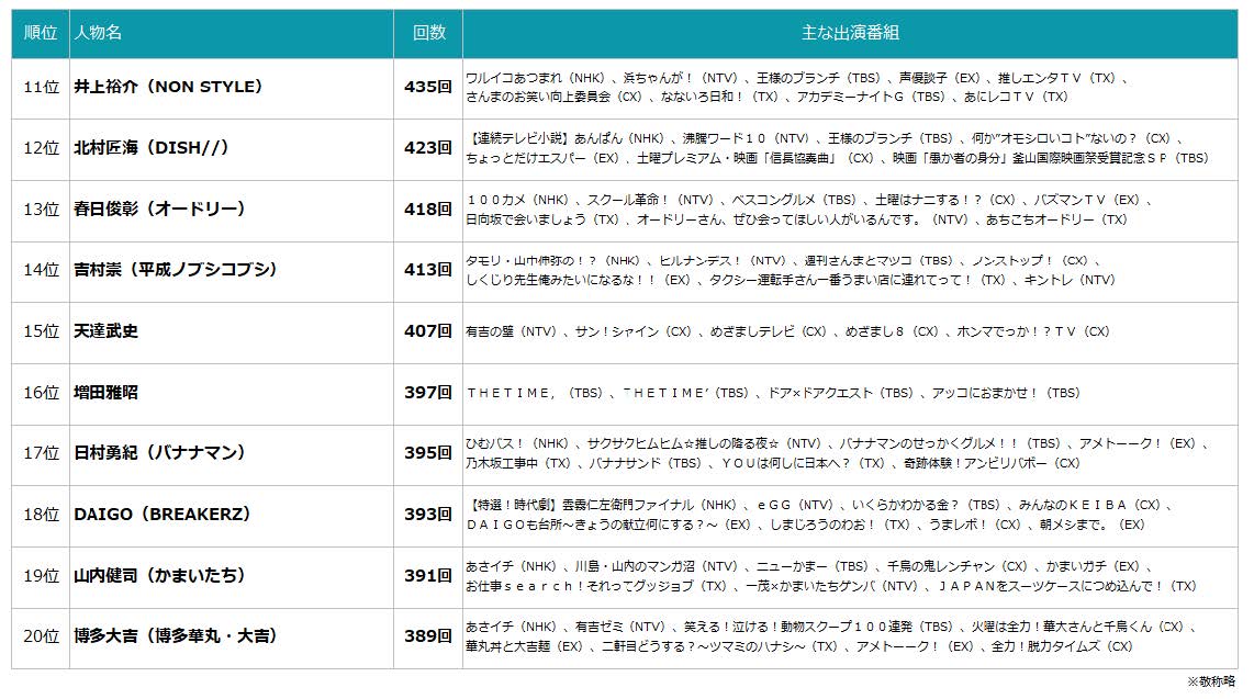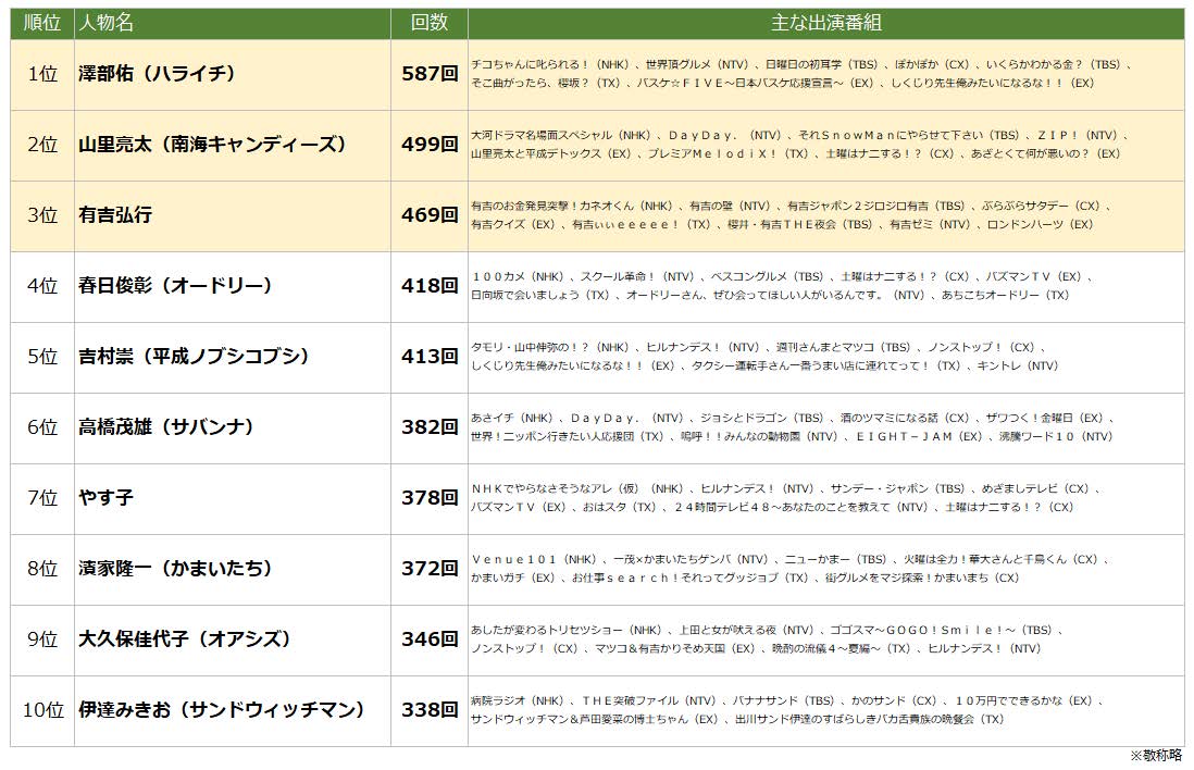 調査対象:NHK総合(Eテレ除く)、日本テレビ、テレビ朝日、TBS、テレビ東京、フジテレビ(東京地区地上波キー局)で放送されたTV番組(再放送番組含む)にレギュラー出演、ゲスト出演した人物を対象。