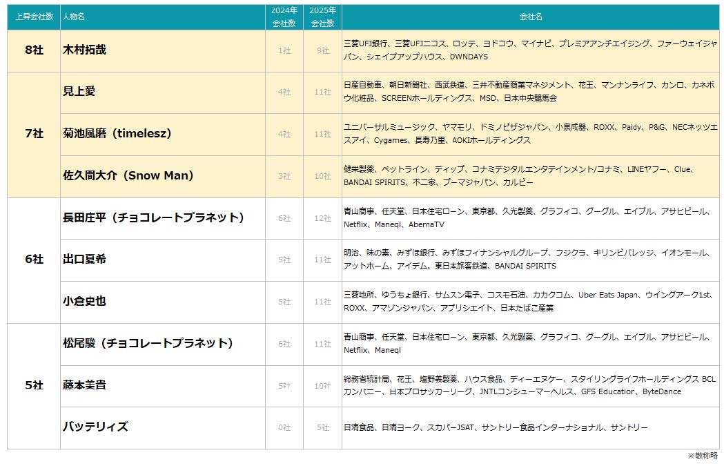 トップは木村拓哉。女性トップは見上愛。2024年のTV-CM会社数に対し、2025年の会社数が増えた今注目のタレントとなる。
