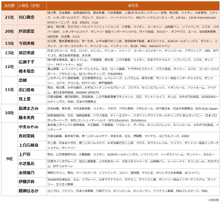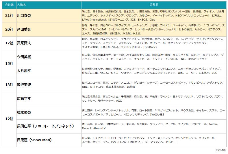 総合トップは、連覇となった川口春奈で21社。男性トップは、こちらも昨年に続き賀来賢人で17社。芦田愛菜は20社で3位から2位にランクアップした。