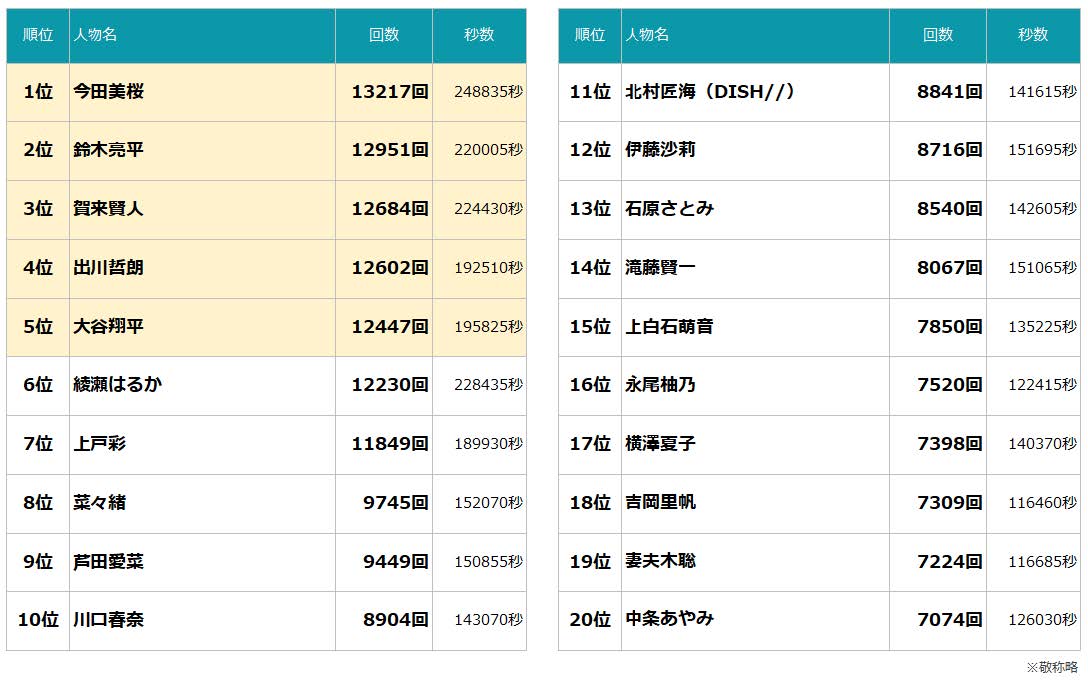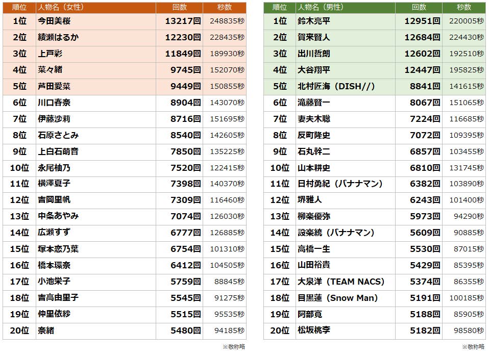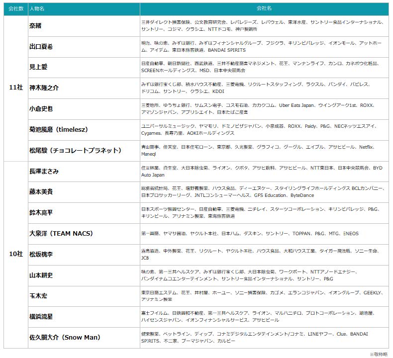 調査対象:日本テレビ、テレビ朝日、TBS、テレビ東京、フジテレビ(東京地区地上波キー局)で放送されたTV-CMに出演・登場した人物を対象。