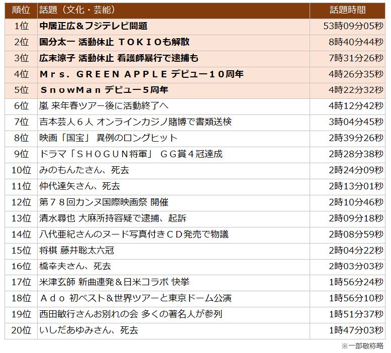 テレビの放送内容をテキスト化した「TVメタデータ」を提供する株式会社エム・データは、「2025年TVニュースランキング」を発表した。 同ランキングは、2025年1月1日(水)から2025年11月29日(土)までの期間、月曜日から土曜日の毎朝10時までに放送しているニュース・ワイドショー番組でのニュースランキング「日刊TVニュース速報」をまとめたものである。
