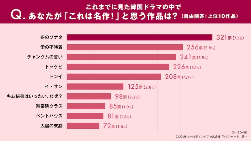 次に、自由回答で「視聴した中で名作だった作品」を聞いたところ、1位「冬のソナタ(321票)」、2位「愛の不時着(256票)」、3位「宮廷女官チャングムの誓い(241票)」という結果になった。韓流ブームの火付け役となった「冬のソナタ」は、切ない恋愛模様と美しい映像で今なお根強い人気を誇り、世代を超えて“韓国ドラマの原点”として語り継がれている。