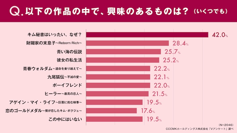 また、『韓流チャンネル』がオススメする10作品から「興味のある作品」を聞いたところ、1位「キム秘書はいったい、なぜ?(42.0%)」、2位「財閥家の末息子〜Reborn Rich〜(28.4%)」、3位「青い海の伝説(25.7%)」となった。1位に輝いた「キム秘書はいったい、なぜ?」は、「視聴した中で名作だった作品」の7位にも選ばれており、ラブコメの王道を極めた胸キュン展開と、主演パク・ソジュンの魅力が視聴者の期待を高めていることがうかがえる。