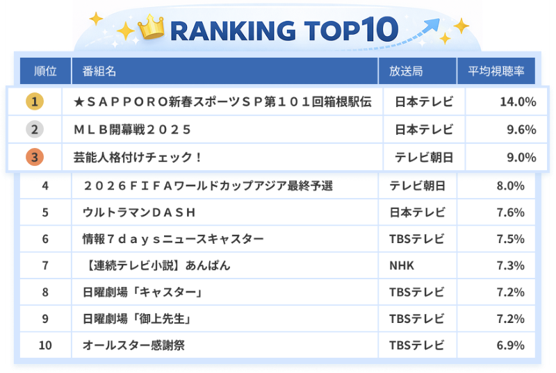 シリーズ別ランキングをカテゴリ別に見ると、スポーツは「箱根駅伝」や「MLB開幕戦2025」、ニュース・報道は「情報7daysニュースキャスター」や「ニュース7」、ドラマは「日曜劇場」や「連続テレビ小説」、バラエティは「芸能人格付けチェック!」「ウルトラマンDASH」「オールスター感謝祭」など、各ジャンルの定番番組が上位を占めた。