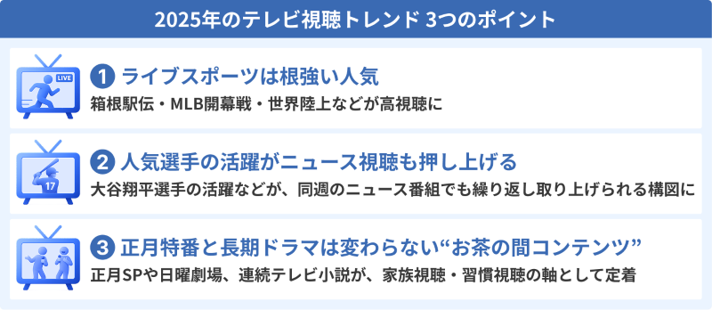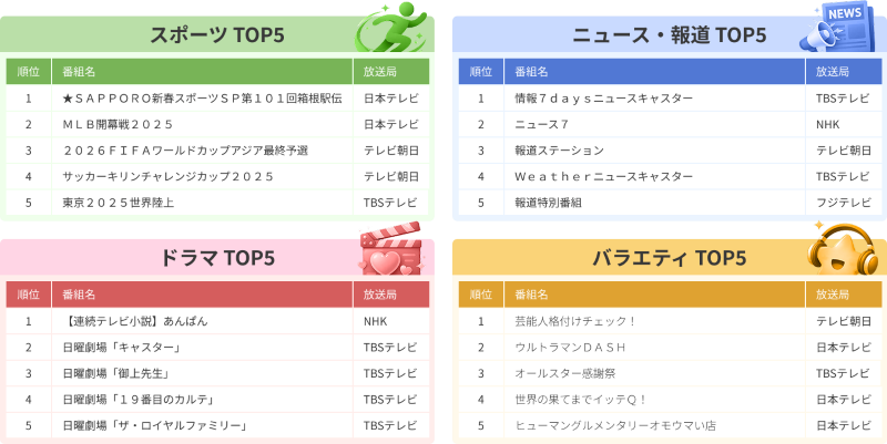 箱根駅伝やMLB開幕戦、FIFAワールドカップアジア最終予選、世界陸上などのライブスポーツに加え、夜のニュース・報道番組、正月特番や日曜劇場シリーズ、連続テレビ小説などの長期ドラマが上位に並び、「ライブスポーツ」「夜のニュース」「長期ドラマ・正月特番」が2025年のテレビ視聴を特徴づける結果となった。