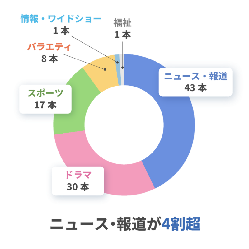番組別の視聴データTOP100をカテゴリ別に集計したところ、ニュース・報道番組が43本と全体の4割超を占め、ドラマが30本、スポーツが17本と続いた。バラエティが8本、情報・ワイドショーが1本、福祉番組が1本という結果で、ニュース・報道とドラマ・スポーツの3カテゴリだけで全体の9割近くを占めている。