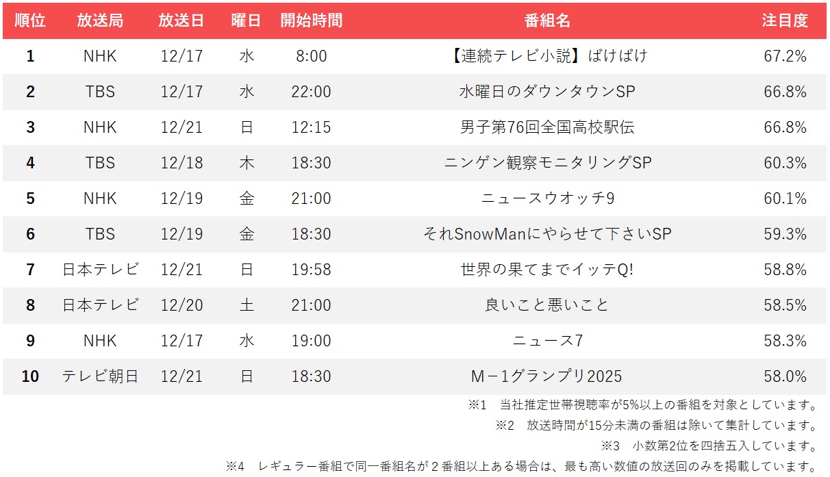 高校駅伝の健闘と年末特番が上位を独占!週間テレビ番組注目度ランキング【12月15日(月)~12月21日(日)】