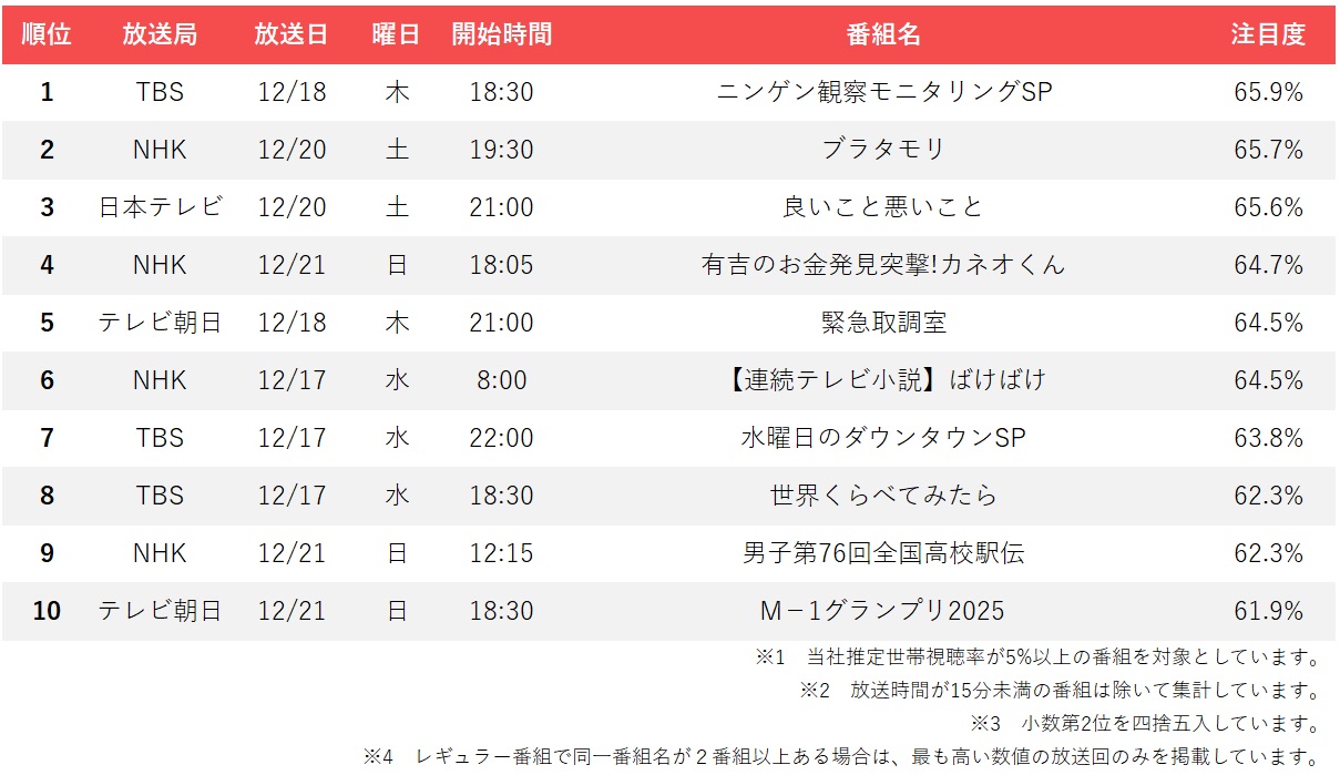 2025年も残すところあとわずかとなり、今週のランキングでは年末ならではの強力な特別番組や、冬の風物詩ともいえるスポーツ中継が上位を席巻する結果となった。個人全体で1位を獲得したTBS『ニンゲン観察モニタリングSP』をはじめ、各局が年内最後の放送として枠を拡大した「SP番組」がお茶の間の関心を独占している。