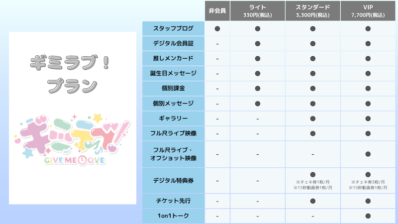 誕生日メッセージ、個別メッセージ、FC先行チケット販売、マイトークや各グループをまとめて応援できる「pechuniaプラン」を用意している。