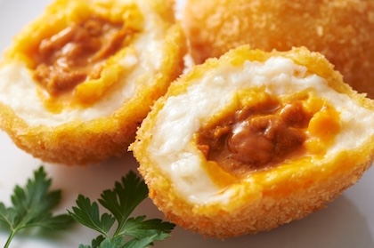 蜂の家特製のビーフカレーをもちっとしたドーナツ生地で包み、カリッと揚げました。