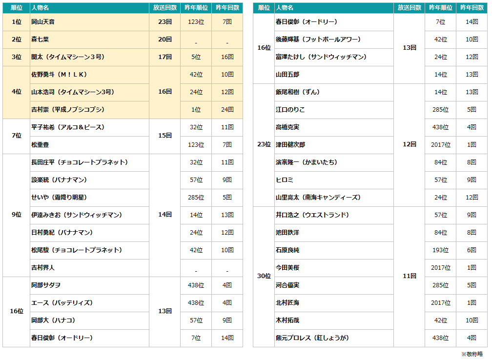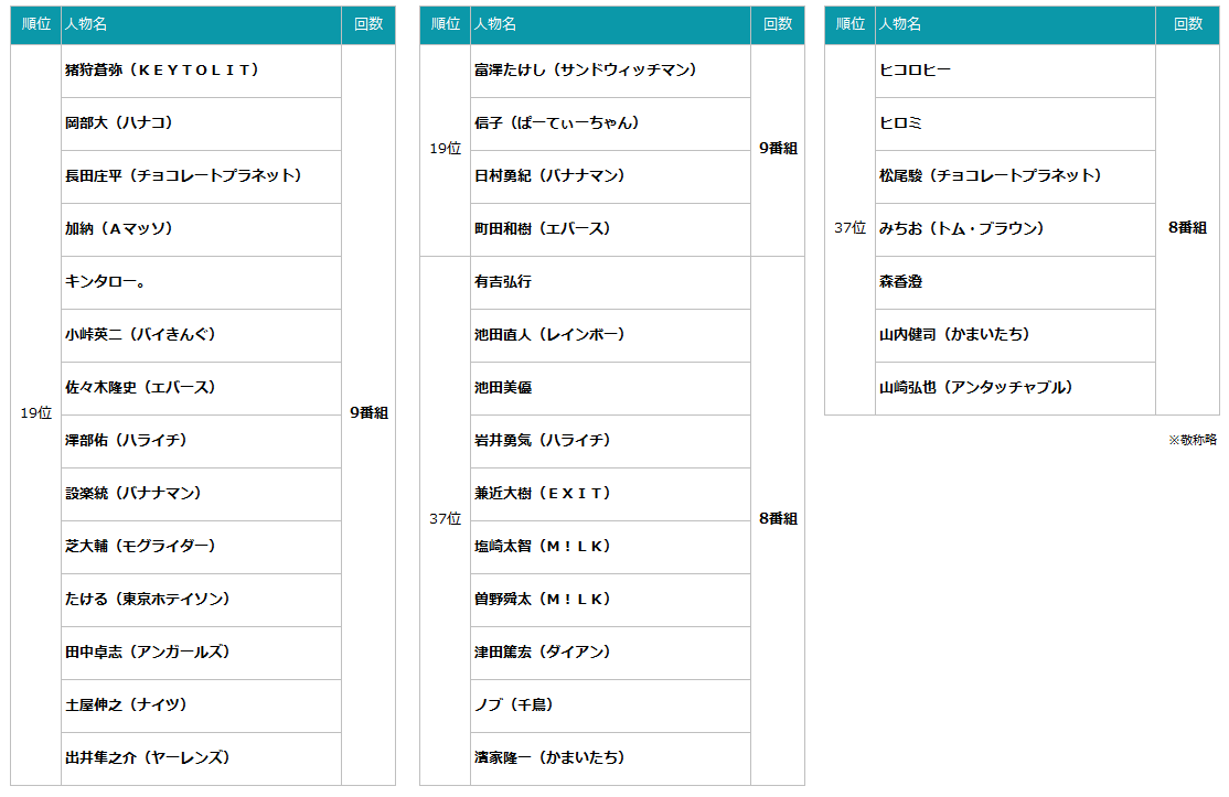 ・放送回数:上記対象の出演放送回数を、同一番組名(同一シリーズ)をそれぞれカウントした、放送回数のランキング集計。