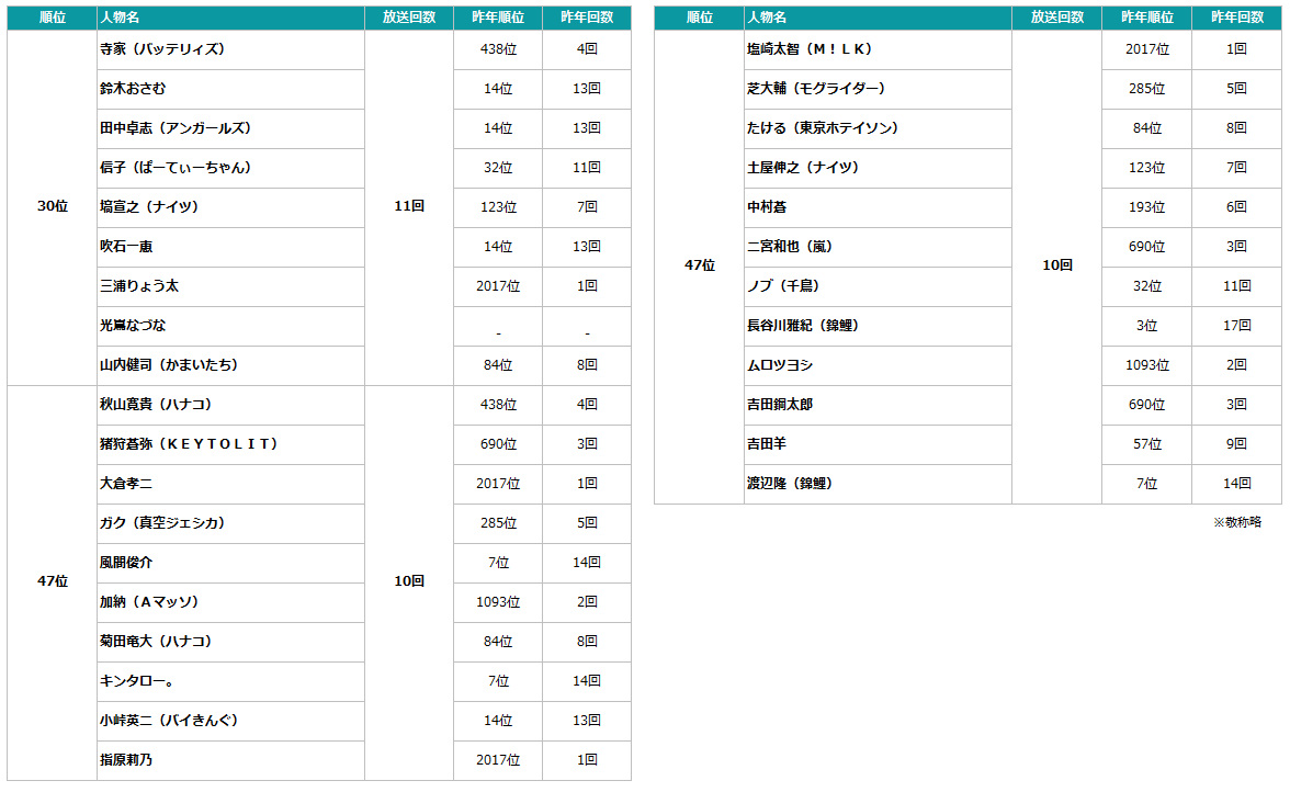 ・番組本数:上記対象の出演放送回数を、同一番組名(同一シリーズ)を除外しカウントした、番組本数のランキング集計。