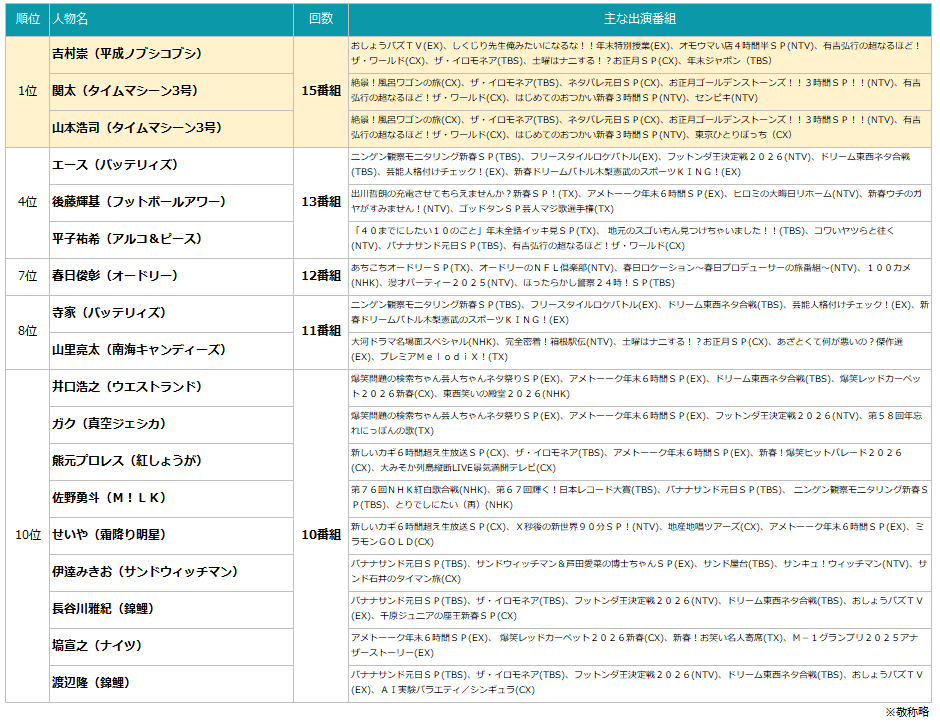 ■2025年~2026年の年末年始TV番組出演ランキング (出演番組放送回数)