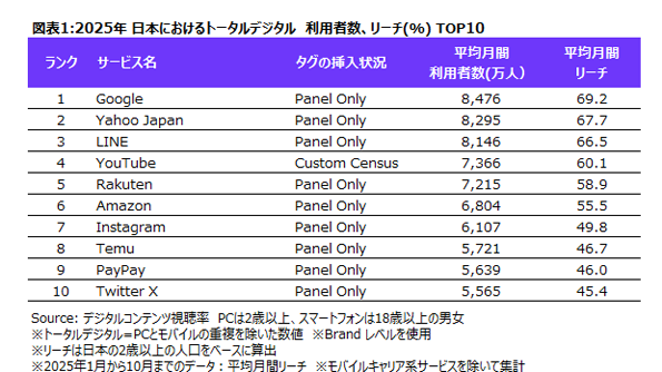 まず、2025年のデジタルサービスの利用動向としてPCとモバイルの重複を除いたトータルデジタルのリーチと利用者数に着目すると、上位3サービスの「Google」「Yahoo Japan」「LINE」は8,000万人を超え、人口の60%以上にリーチするサービスとなっている。EC分野では、「Temu」が5,721万人に利用され、8位と新たにTOP10に加わった(図表1)。