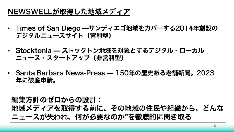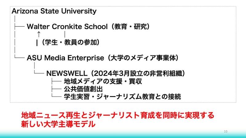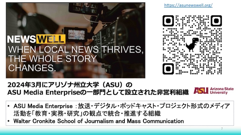 その最新の動きとして、脇浜氏はアリゾナ州立大学(ASU)が主導する「NEWSWELL」という非営利組織の取り組みを紹介。これは、大学が経営危機に瀕したローカルニュースメディアを傘下に収め、非営利化することで再生を支援するモデルだという。