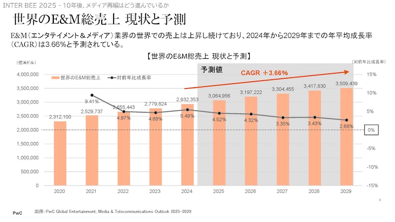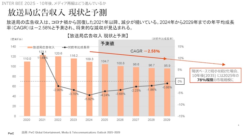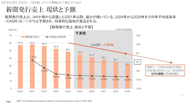 PwCコンサルティングの予測によると、世界のエンタメ・メディア市場が年率3.6%で成長する一方、日本の放送市場は今後、年率マイナス2%以下のペースで縮小を続け、10年後には現在の8割以下の市場規模になると試算。新聞市場に至っては、年率8%近い率で縮小し、10年後には現在の4割強の規模にまで落ち込む見込みだという。