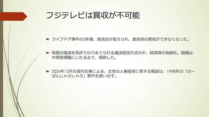 「『認定放送持ち株会社に対し、単一の株主が3分の1以上の議決権を持ってはいけない』と定めたこの規制により、事実上、外部からの買収が不可能となり、その結果、新卒入社のプロパー社員が経営を担い続ける無風状態が生まれた」