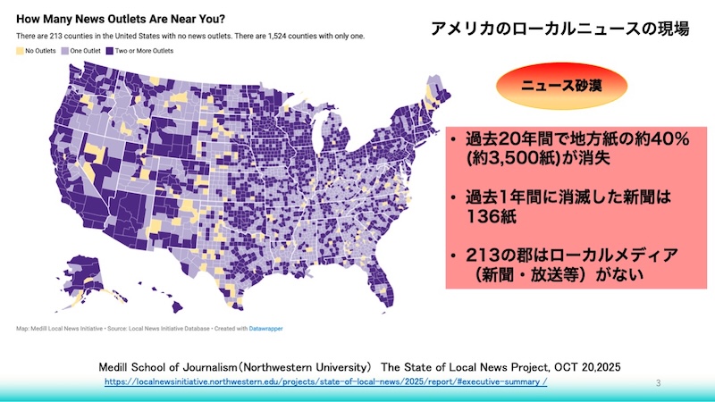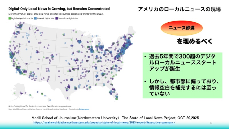 「過去20年で地方紙の約4割が廃刊し、5000万人が地域情報にアクセスできない状況にある。一方、その受け皿として非営利のデジタルニュースメディアが次々と誕生している。特に近年は、調査報道だけでなく、地域の最新ニュースを扱うローカル志向の非営利メディアが増加傾向にある」