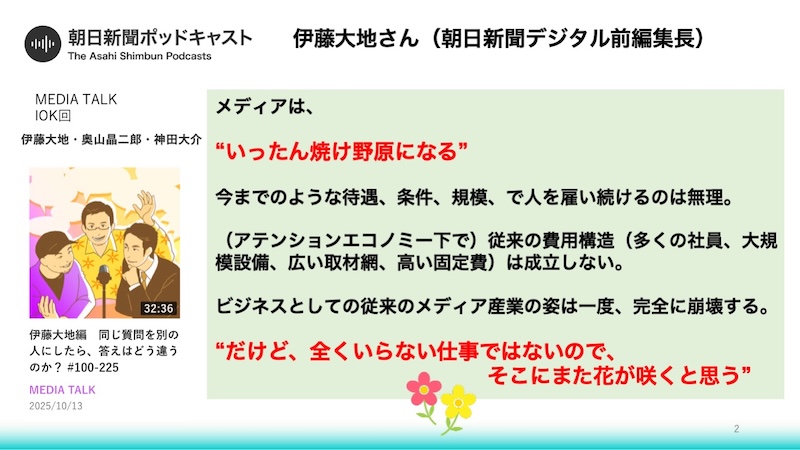 脇浜氏は「メディアは一旦焼け野原になる」という、朝日新聞デジタル前編集長・伊藤大地氏の言葉を引用しつつ、「完全に崩壊しても、いらない仕事ではない。そこにまた花が咲く」と再生への希望を語った。