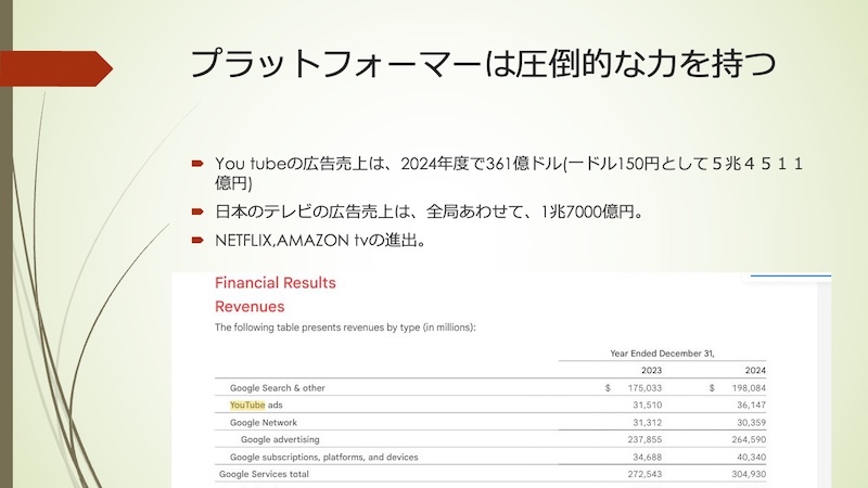これに対し下山氏は、「YouTubeの広告売上は日本のテレビ広告市場をはるかに上回っている」と語り、「プラットフォーマーが圧倒的な力を持つという前提で戦略を立てる必要性がある」と強調した。