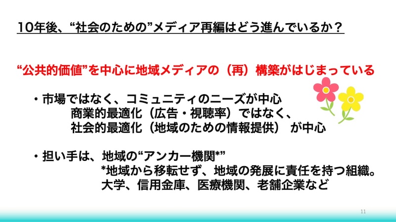 脇浜氏は、「特定のリーダーに依存しがちな市民メディアと異なり、大学という大きな組織に組み込まれることで、持続可能性が格段に高まる」と分析。日本でも、各地域にある大学が地域メディアの新たな担い手「アンカー機関」となり得ると、未来のモデルとして提示した。