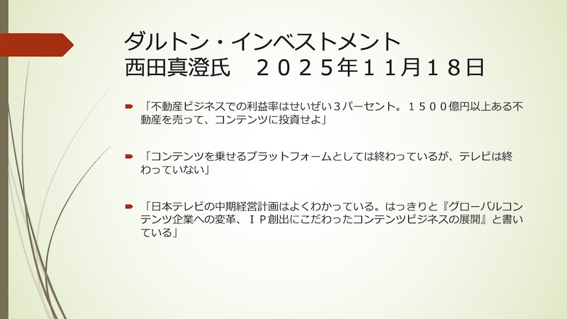 「東証における『PBR 1倍割れ』の企業を調べたら、銀行より低かったのがキー局。その中でも最低だったのがフジ・メディア・ホールディングスだった。資本市場からいかにテレビ局が非効率な経営と見なされているかということだ」