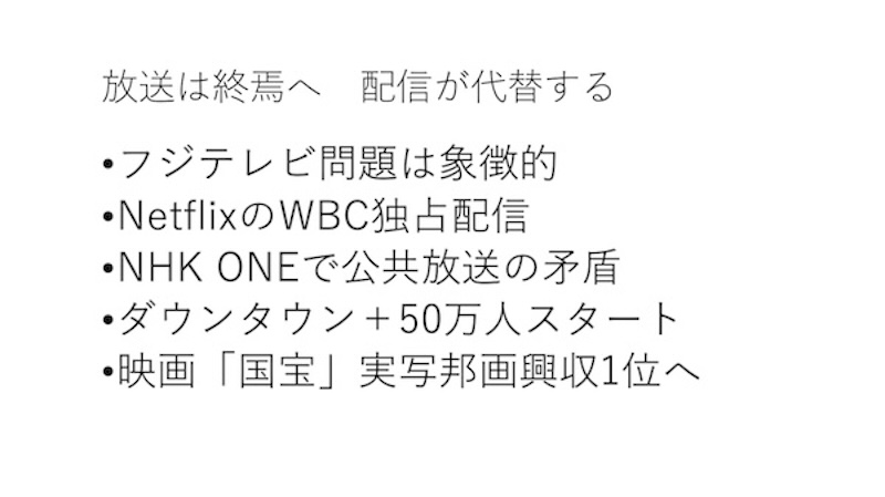 セッションの冒頭、モデレーターの境治氏は、フジテレビで起きた一連の問題や、キー局によるローカル局の系列化・集約化の動きを挙げ、「放送という伝送路で成功したビジネスモデルを変えなければいけない局面に今ある」と問題提起。