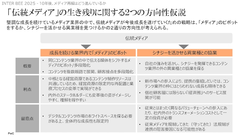 一つは、同じコンテンツ業界の中で媒体をシフトする「メディアのピボット」。活字から動画、電波から配信へと軸足を移すこの方法は、「すでに競争の激しい市場での戦いとなり、成長は限定的」としつつ、「既存の経営資源を活かしやすく、変革のイメージも共有しやすい」と語る。