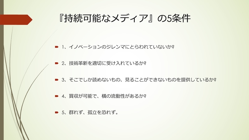 最後に下山氏は、自身が著書でまとめた「持続可能なメディアの5か条」を提示。