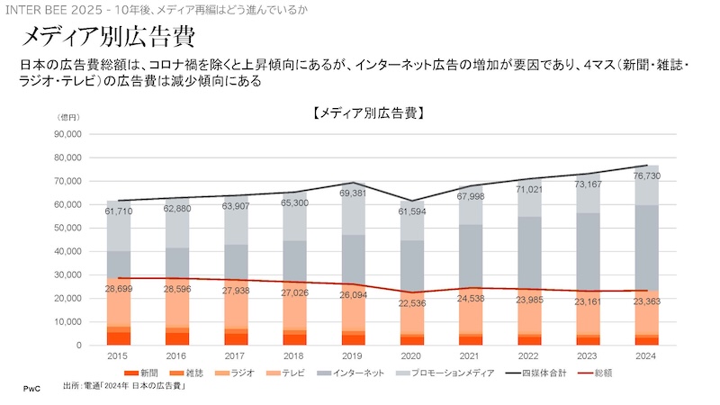 「日本のメディア市場全体はマクロ経済に連動し微増傾向にあるものの、その成長を牽引しているのはインターネット広告であり、放送や新聞といった伝統的な4マス媒体の市場は残念ながら順調にシュリンクしていると言わざるを得ない」