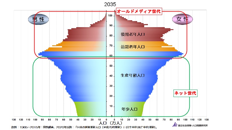 10年後の人口動態の変化を示し、「オールドメディアに親しんだ世代が少数派となり、社会の中枢がネット世代に入れ替わることでメディア環境が激変する」と予測した。