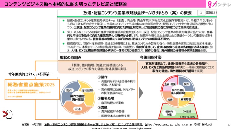 これらの官民の動きが交差する中心点として、竹内氏は、総務省の「放送配信コンテンツ産業戦略検討チーム」の最終取りまとめを紹介した。