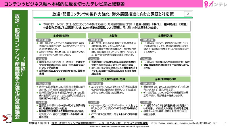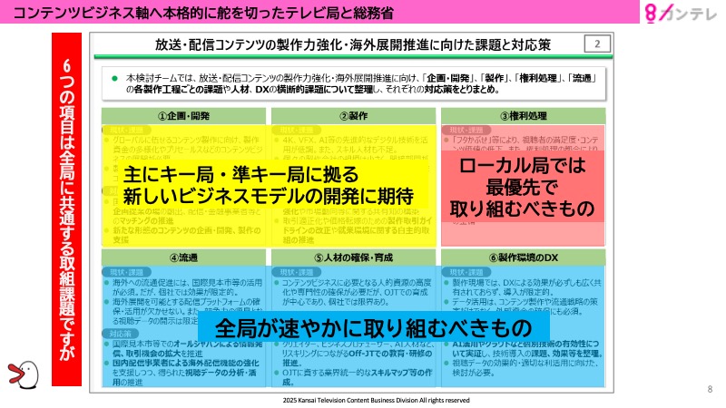 この取りまとめでは、今後の日本のコンテンツ産業が取り組むべき課題を「企画・開発」「製作」「権利処理」「流通」「人材確保・育成」「製作環境のDX」の6項目に整理。竹内氏は「各局の体力に応じて優先順位が異なる」としたうえで、キー局は「企画・開発」と「製作」に、ローカル局は「権利処理」体制の構築に最優先で取り組むべきとの見方を示した。