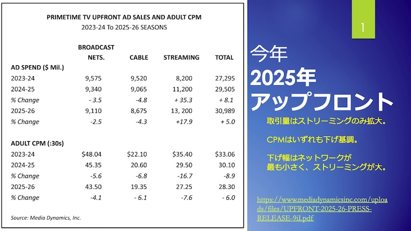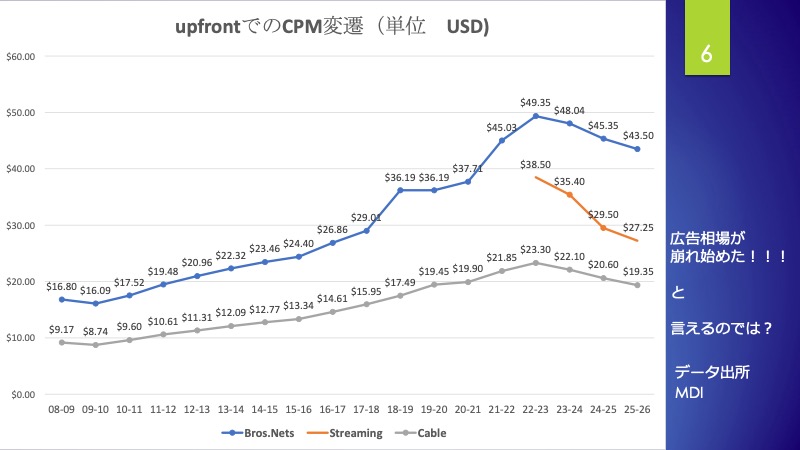 内山氏は、米国テレビ広告市場の先行指標であるアップフロント取引のデータを提示。ネットワーク、ストリーミング、ケーブルのいずれの広告単価(CPM)も、2022年シーズンをピークに「全部“ダダ下がり”の状態に陥っている」とし、その背景にAmazonなどによるネット広告枠の大量供給があると指摘した。