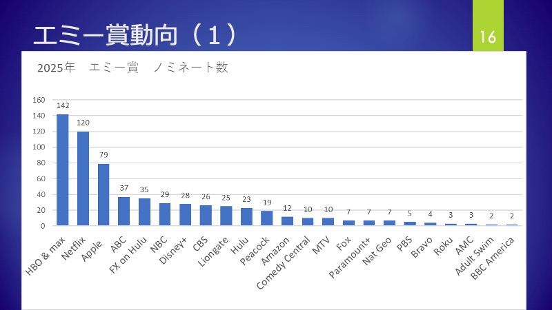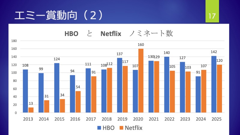 内山氏は、近年のエミー賞のノミネート数において、HBO MaxとNetflixが熾烈なトップ争いを繰り広げているグラフを提示。「単に作品の量を拡大しただけでなく、批評的に評価される『質』の面でも両社が業界のトップランナーになっている」と語り、「日本もこれから『質』でどう戦っていくのかが課題になってくるのではないか」と投げかけた。
