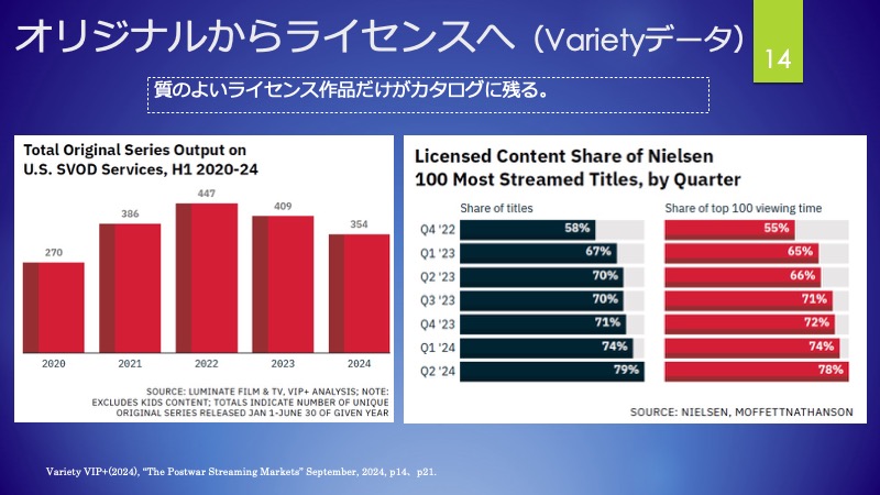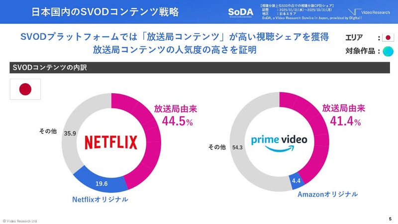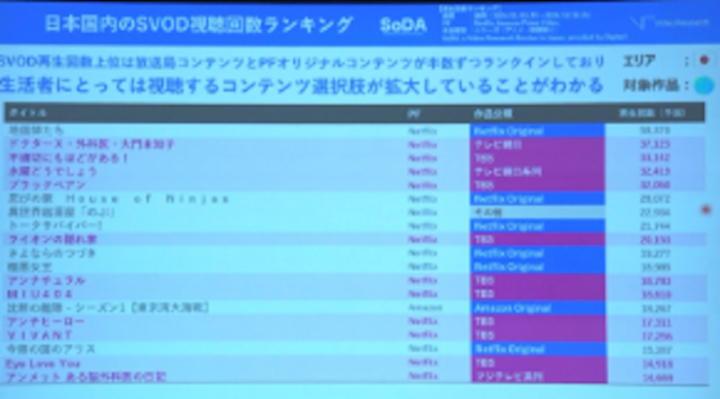 日本国内のSVODプラットフォームにおける人気作品ランキングでは、放送局由来のコンテンツとプラットフォームのオリジナル作品が「半々ぐらい」の比率でランクイン。