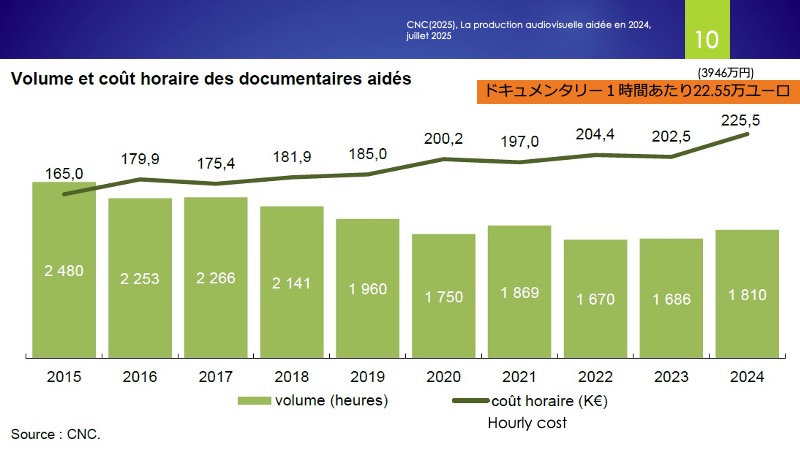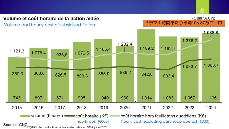 「公的な統計データが存在するフランスを例に挙げると、ドラマ1時間あたりの平均制作費は日本円換算で約1億8700万円、プライムタイムの作品に限定すれば2億5000万円を超える。ドキュメンタリーでも約3900万円、アニメでは1時間あたり約1億6000万円に達する」