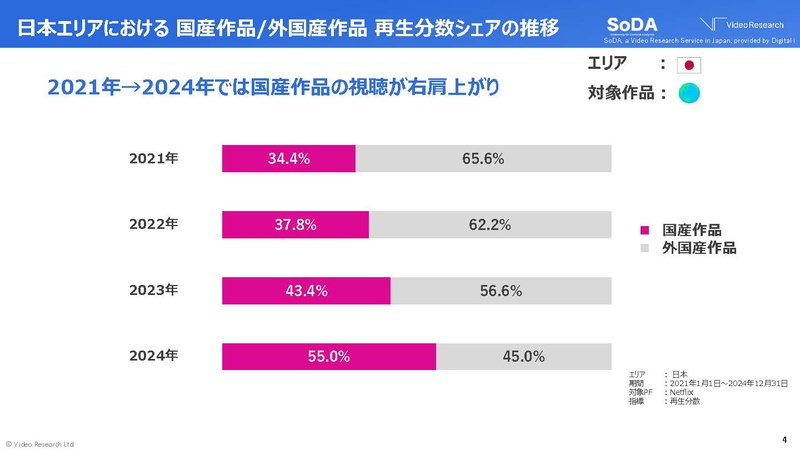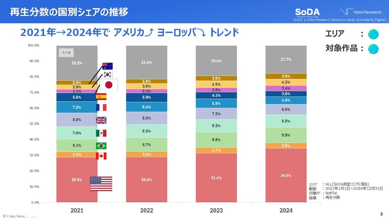 「国別シェアでは依然として米国が最大かつ増加傾向にある一方、日本国内に目を向けると、日本作品の視聴シェアが年々増加していることが明らかになった。VODサービスが専門的なファン層から一般層へと浸透する『大衆化』の証左といえる」(松岡氏)