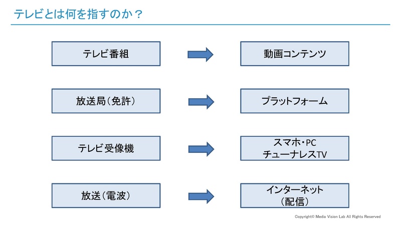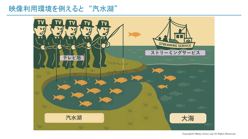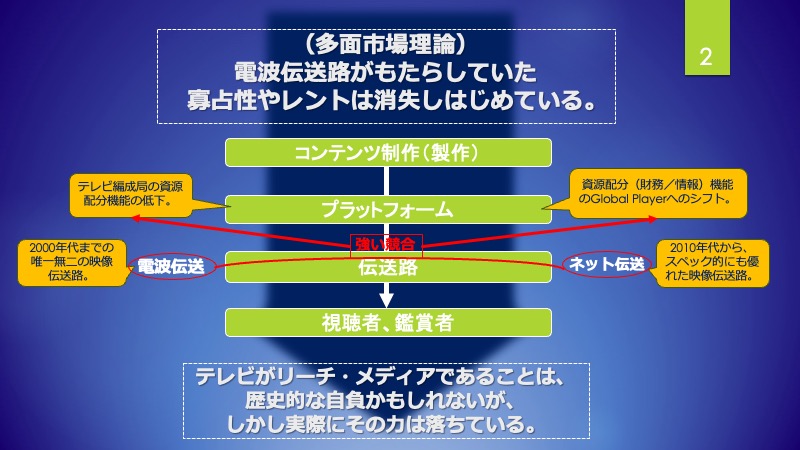 「4K・8Kクラスの高画質映像ですら安定してネット伝送できる時代が到来し、かつて電波が独占していた映像伝送の優位性は完全に失われた。放送免許という参入障壁に守られていた市場は、誰でも参入できるグローバルな競争の渦に飲み込まれている」