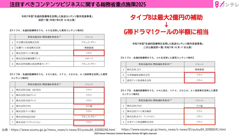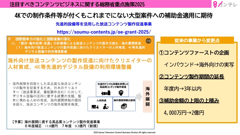 その一つである放送コンテンツの海外展開支援事業では、「制作費の増額」「番組内容の自由度拡大」「複数年にまたがる制作の実現」といった事業者の要望が反映され、今年度の事業では補助金上限が2億円に引き上げ、制作期間も最大3年まで猶予が設定されるなど、画期的な内容へと進化しているという。