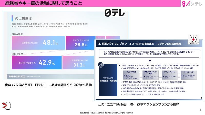 竹内氏は、今後の放送局が目指すべき事業形態として、「放送だけのビジネスから、放送とコンテンツビジネスの二刀流に適合していく必要がある」とコメント。メジャーリーグでの日本人選手の活躍になぞらえた表現で意見を述べた。