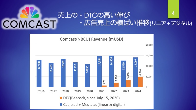 「リニア放送を中心とした広告収入は、配信プラットフォーム上のデジタル広告を含めても、全体としては『ようやく横ばいを維持できている』のが実情。その一方で、Disney+などのDtoCサービスの契約者収入は未だに伸び盛りであり、企業の成長を牽引している」