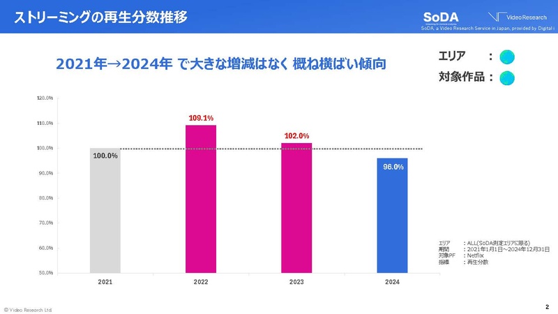 まず示されたのは、Netflixのグローバルでの総視聴分数が近年「概ね横ばい傾向」であるというデータ。内山氏が指摘した「コンテンツ投資の頭打ち」とも符合し、市場が飽和しつつあることを裏付けた。