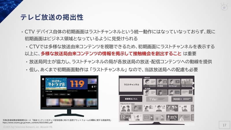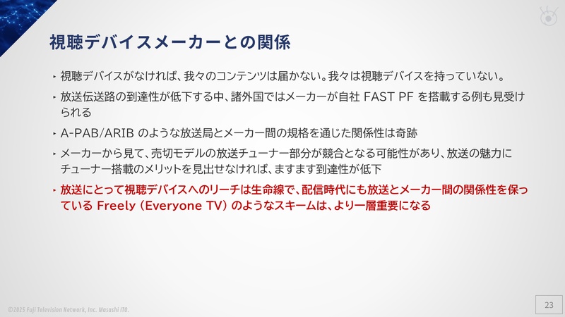 伊藤氏は、今後の放送業界の課題として、放送コンテンツへの接触機会につながるプロミネンス(掲出性)、「チューナーレスTV」など多様な視聴デバイスへのリーチ(到達性)の確保、デバイスメーカーとの関係性の再構築、3点を挙げ、放送局がコンテンツを届けるための基盤そのものが揺らいでいることに強い危機感を示した。