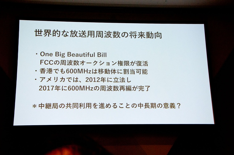 大吉氏はさらに踏み込み、中継局の統廃合などで将来的に空く周波数をどう活用すべきか、という問題提起を行った。