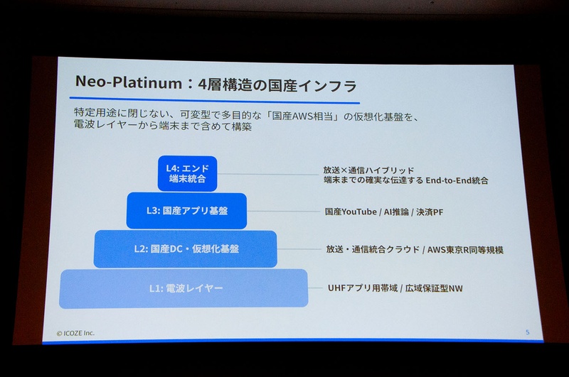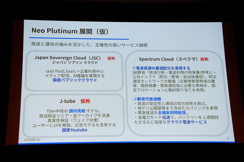 大吉氏はその具体的な対案として、空いた周波数を活用し、国産のデータセンターや仮想化基盤を組み合わせた「ネオプラチナム」「ジャパンソブリンクラウド」構想を披露。放送も通信も柔軟に扱える国家の新たなデジタルインフラを構築し、その上で多様なアプリケーションを展開するという壮大なビジョンを描いた。