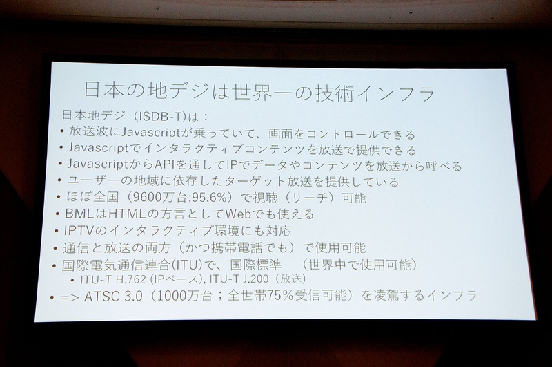 東京大学・川森氏は、長年IPTVやWebの国際標準化に携わってきた経験から、「日本の地デジ(ISDB-T)が世界一の技術インフラだ」と断言。世界で唯一、放送波でJavaScriptコンテンツを伝送できる規格であり、それによってインタラクティブなサービスや地域ごとの天気予報など、ターゲティング放送を実現している技術的優位性を解説した。