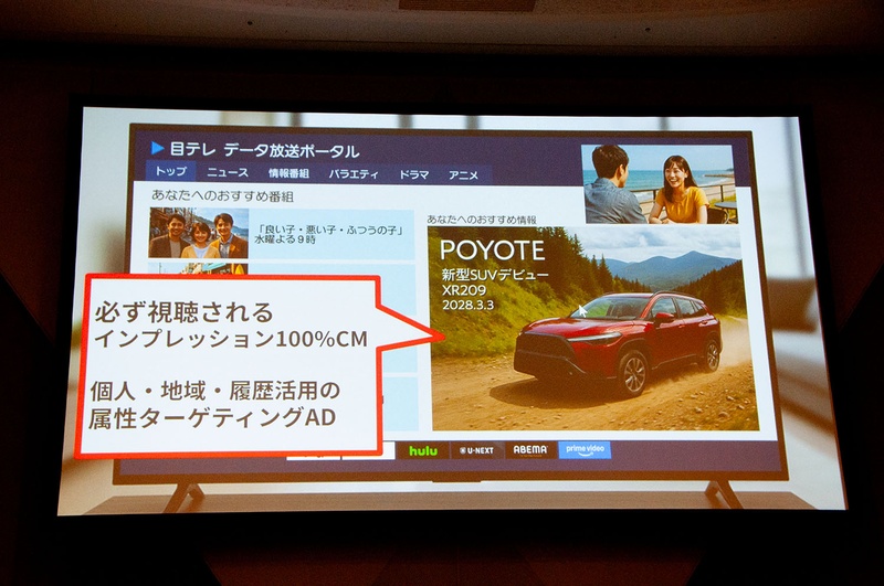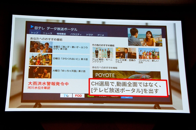 これは、テレビの電源を入れた際や選局時に、いきなり全画面で番組を映すのではなく、まずポータル画面を表示するというアイデア。画面にはTVerIDと連携した「あなたへのおすすめコンテンツ」や、自治体と連携した災害情報、さらには視聴履歴や属性に応じたターゲット広告などが表示される。