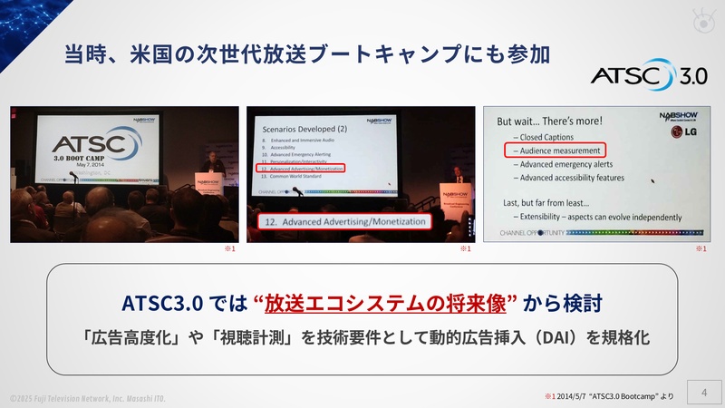これは放送波とインターネットを融合させ、CM枠をターゲットに応じて出し分け可能なデジタル広告に置き換えるもの。技術開発の背景には、10年ほど前に米国の次世代放送規格「ATSC3.0」の検討プロセスから得た学びがあったという。